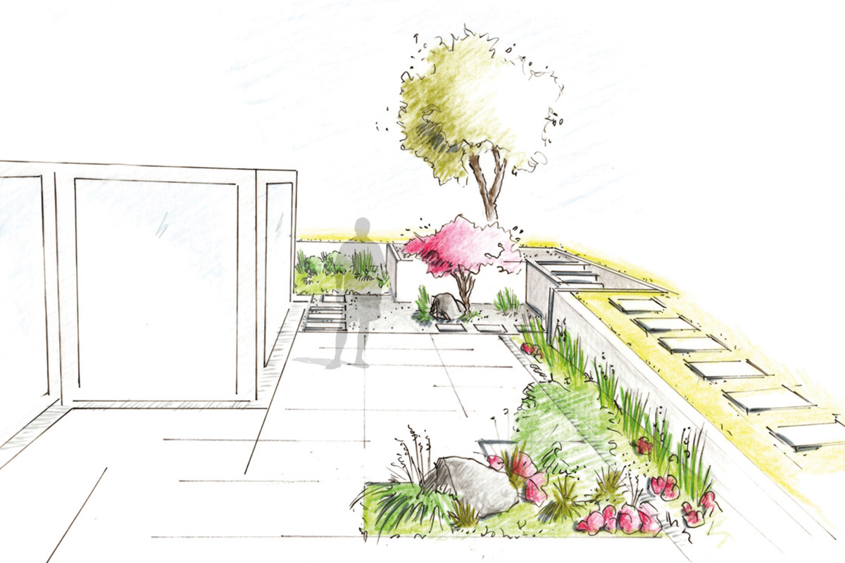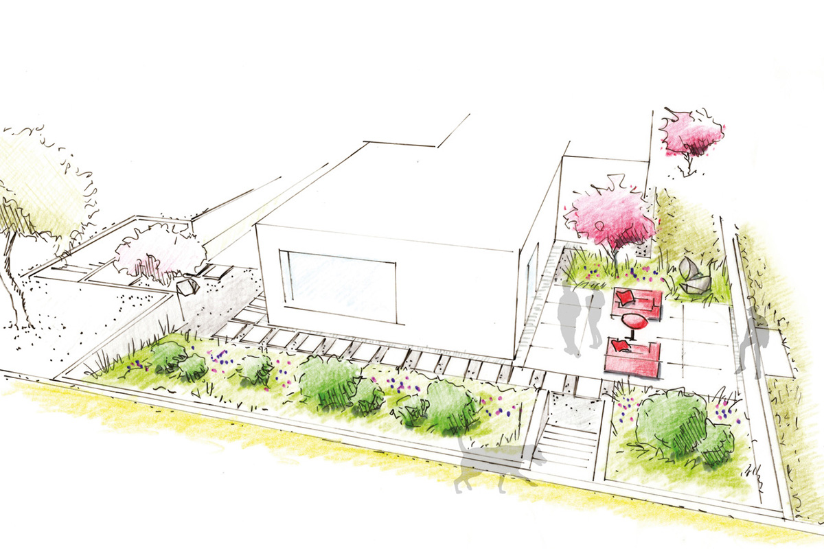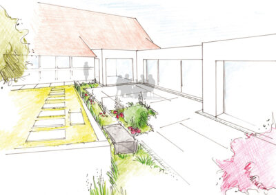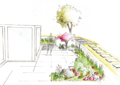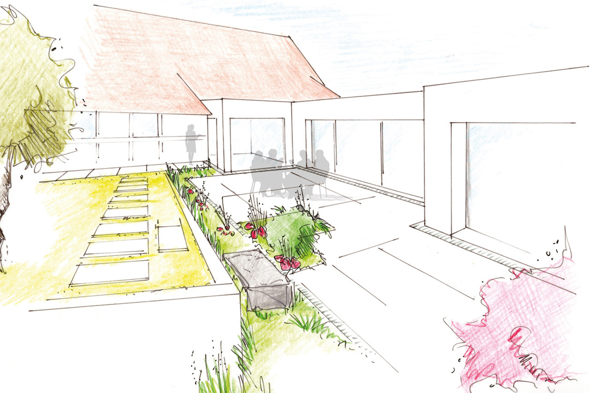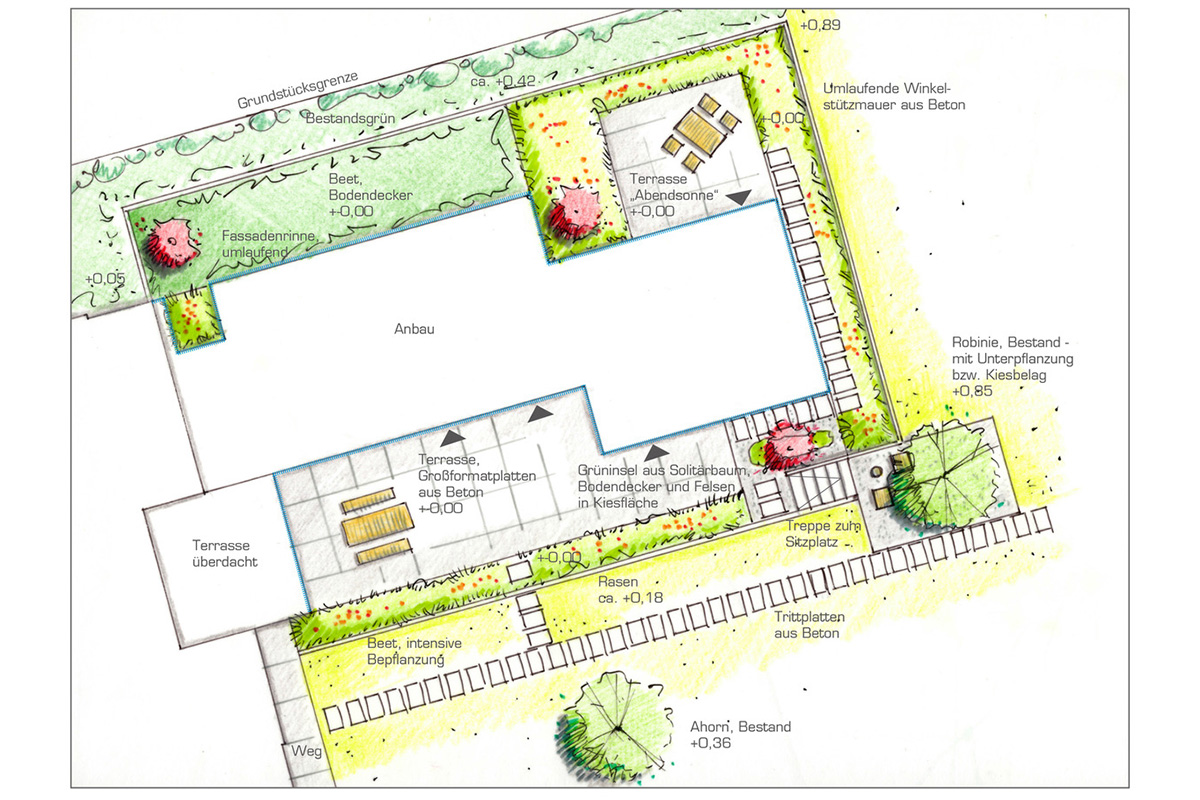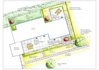 In einem Bestandsgarten mit Waldcharakter soll dem Wohnhaus im hinteren Gartenbereich ein moderner Anbau angefügt werden. Da das Gelände vom Haus weg ansteigt, wird der Anbau in das Gelände hineingebaut. Die Außenanlage wird dementsprechend angepasst und es entsteht somit ein individueller, vertiefter Gartenbereich, der direkt an das Hauptgebäude und den Anbau anschließt. Angrenzende Bestandsbäume werden als kleine Sitzbereiche in den Entwurf mit eingearbeitet und Höhenunterschiede als Sitzgelegenheit genutzt. Schattenverträgliche Pflanzen runden den Entwurf ab und integrieren den Anbau harmonisch in das Gesamtbild.